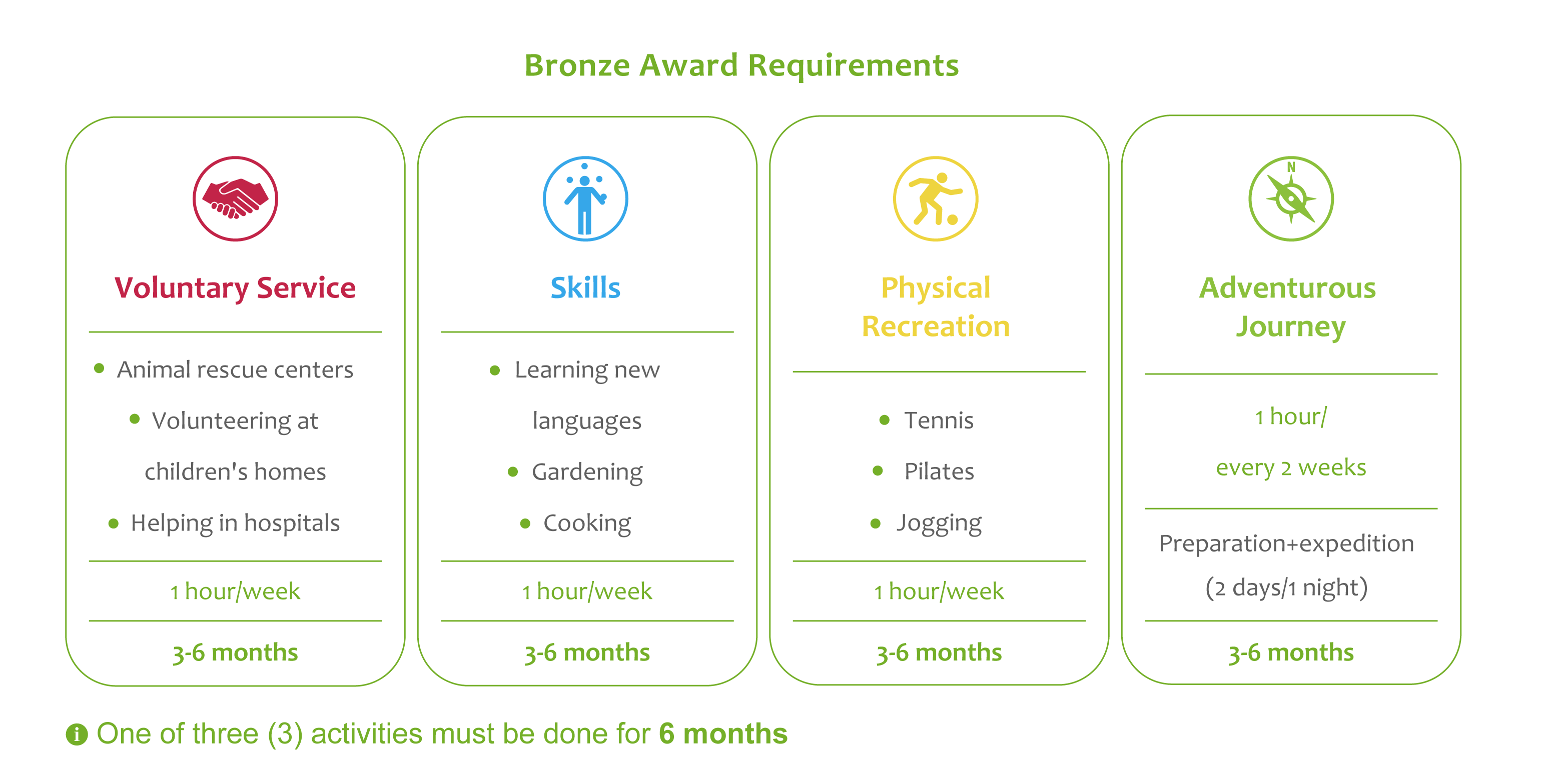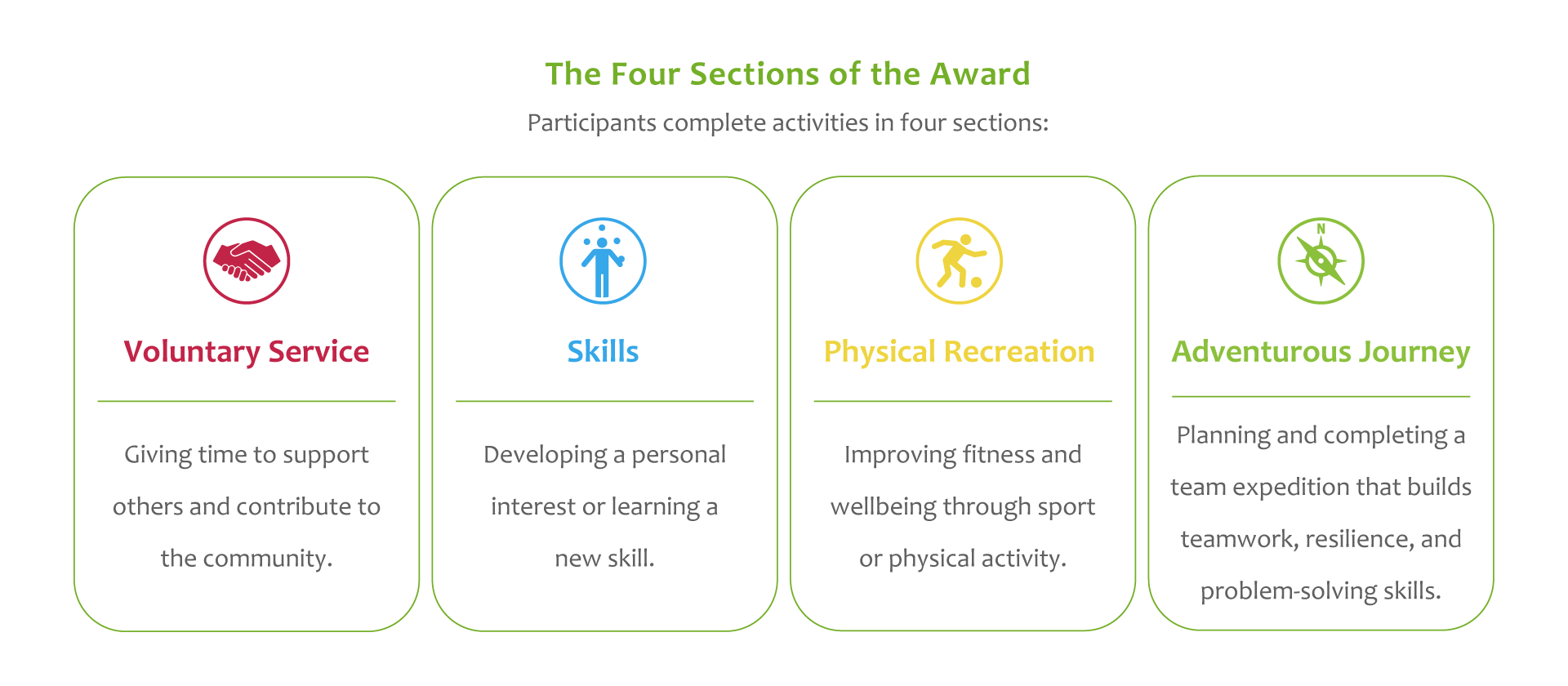 Participants choose one activity in each section – Volunteering, Physical, and Skills – and work on these activities regularly over several months while recording their progress throughout the programme.