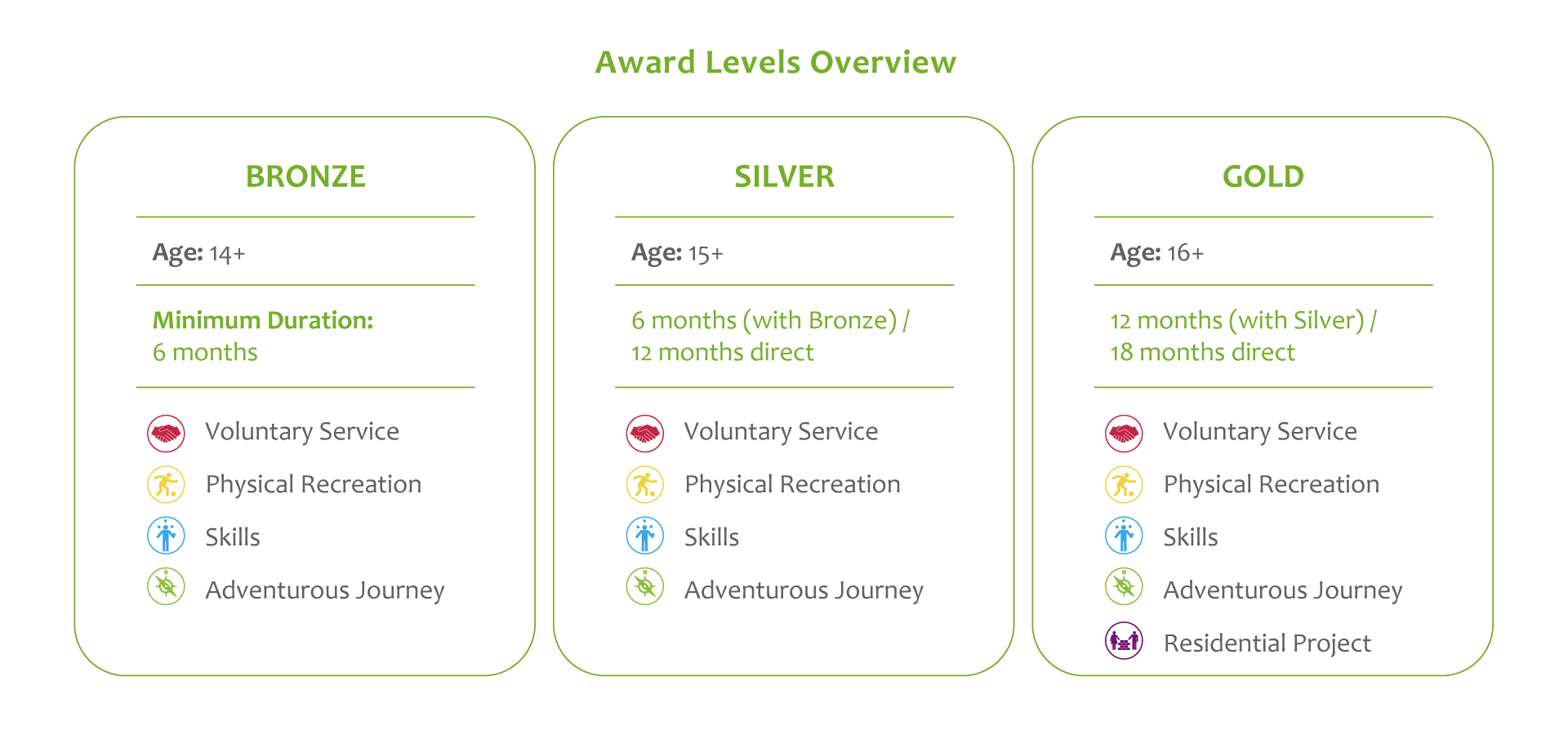 The Duke of Edinburgh’s International Award has three progressive levels. Each level requires a greater level of commitment and challenge, encouraging participants to build resilience, develop new skills, and grow in confidence.