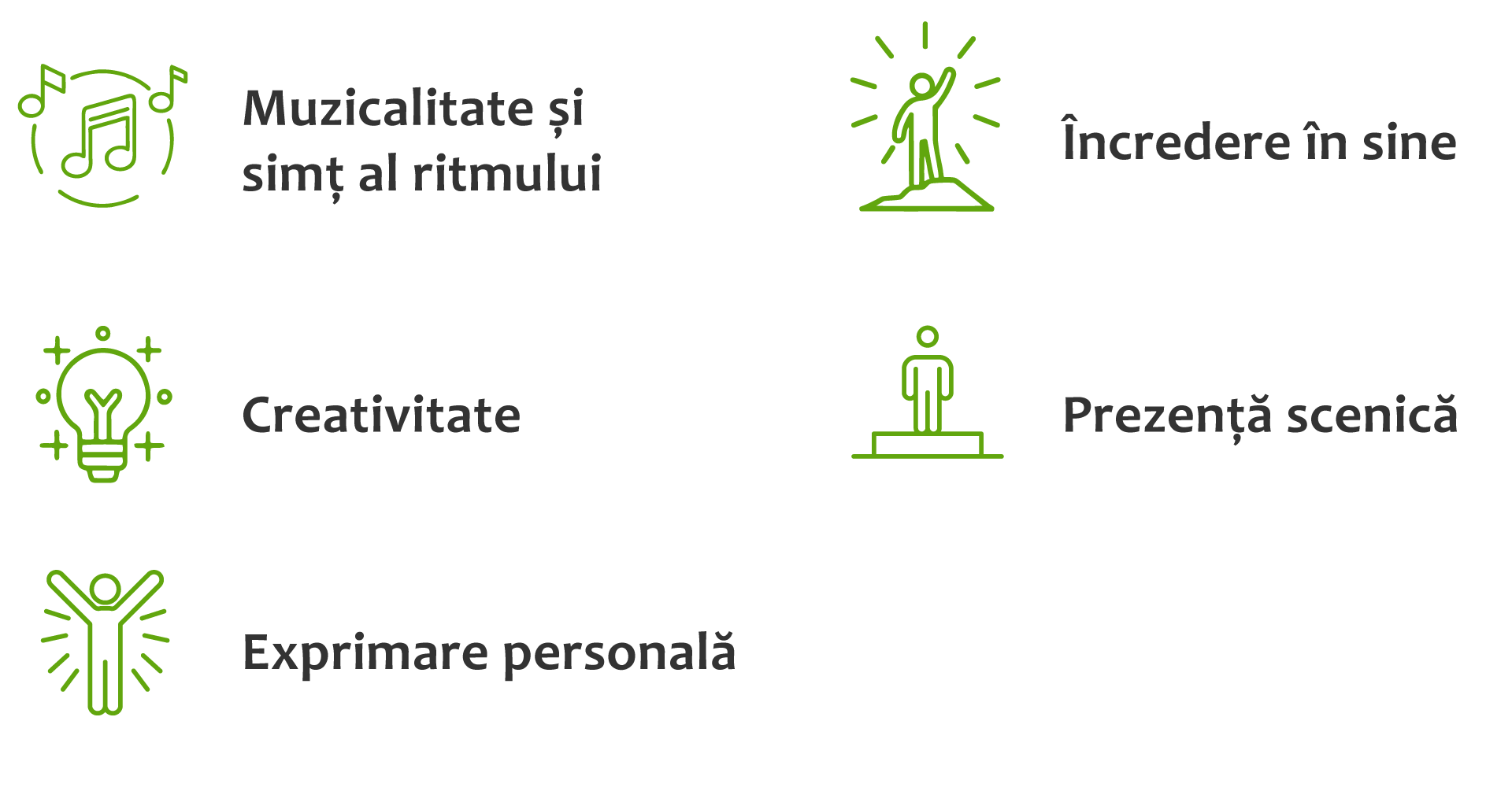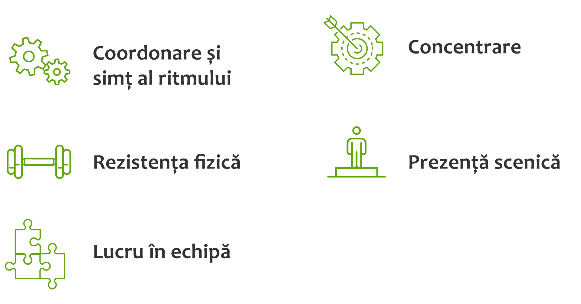 Beneficii: Elevii dezvoltă coordonarea și simțul ritmului, rezistența fizică, spiritul de echipă și încrederea în sine. Clubul sprijină totodată concentrarea, perseverența și prezența scenică prin practică regulată și performanțe de grup.