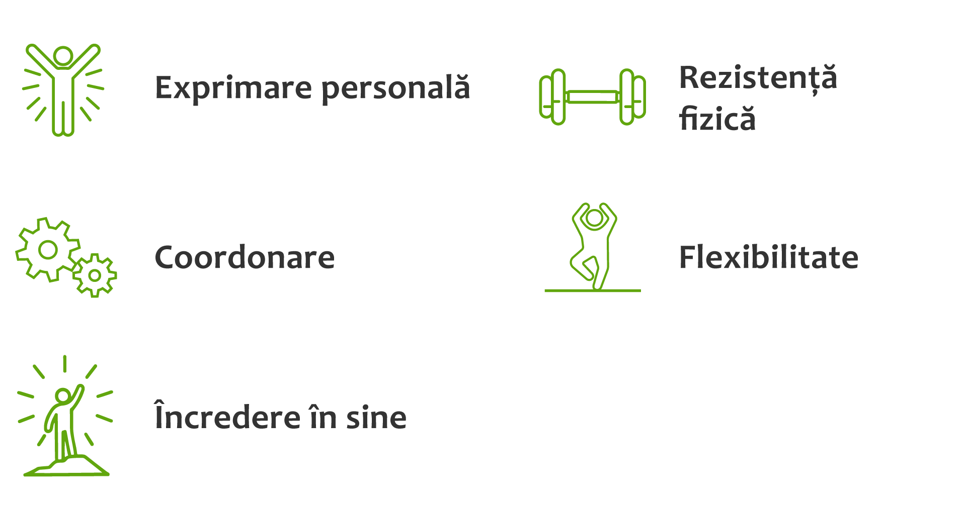 Beneficii: Elevii dezvoltă exprimarea personală, creativitatea, coordonarea, încrederea în sine, rezistența fizică și flexibilitatea. Clubul sprijină totodată lucrul în echipă, cooperarea și percepția spațiului comun prin mișcare de grup.