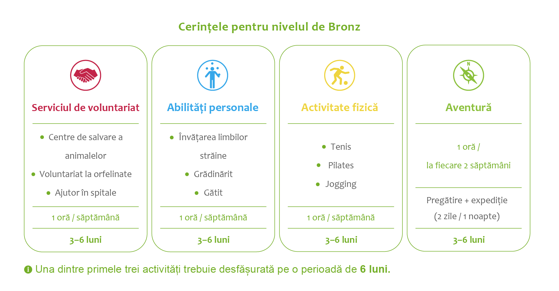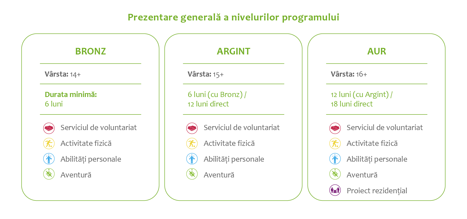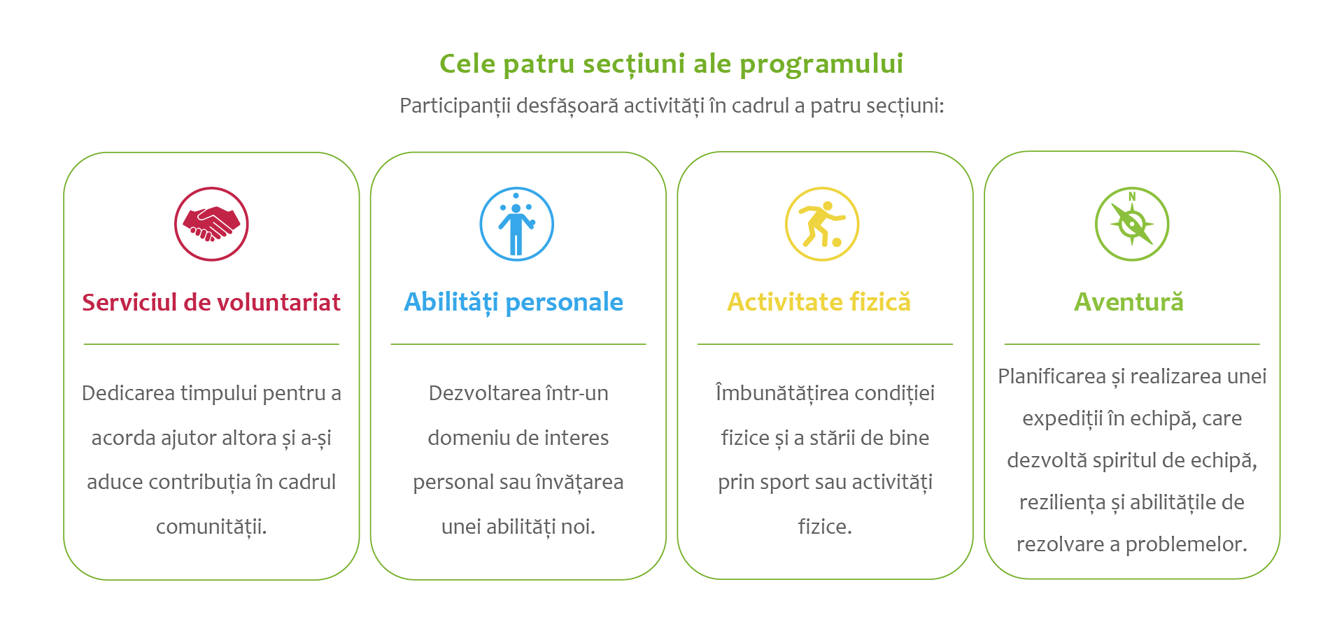 Participanții aleg câte o activitate pentru fiecare secțiune – Voluntariat, Activitate fizică și Abilități personale – și lucrează constant la acestea pe parcursul mai multor luni, înregistrându-și progresul pe tot parcursul programului.